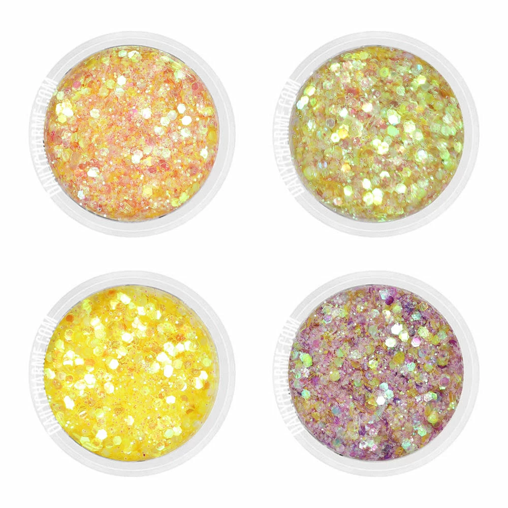 A set of iridescent hex glitter mix in 4 magical shades of enchanting yellow, orange and some purple. These glitter mixes are great in quality, they can be used with nail polish, gel or acrylic.