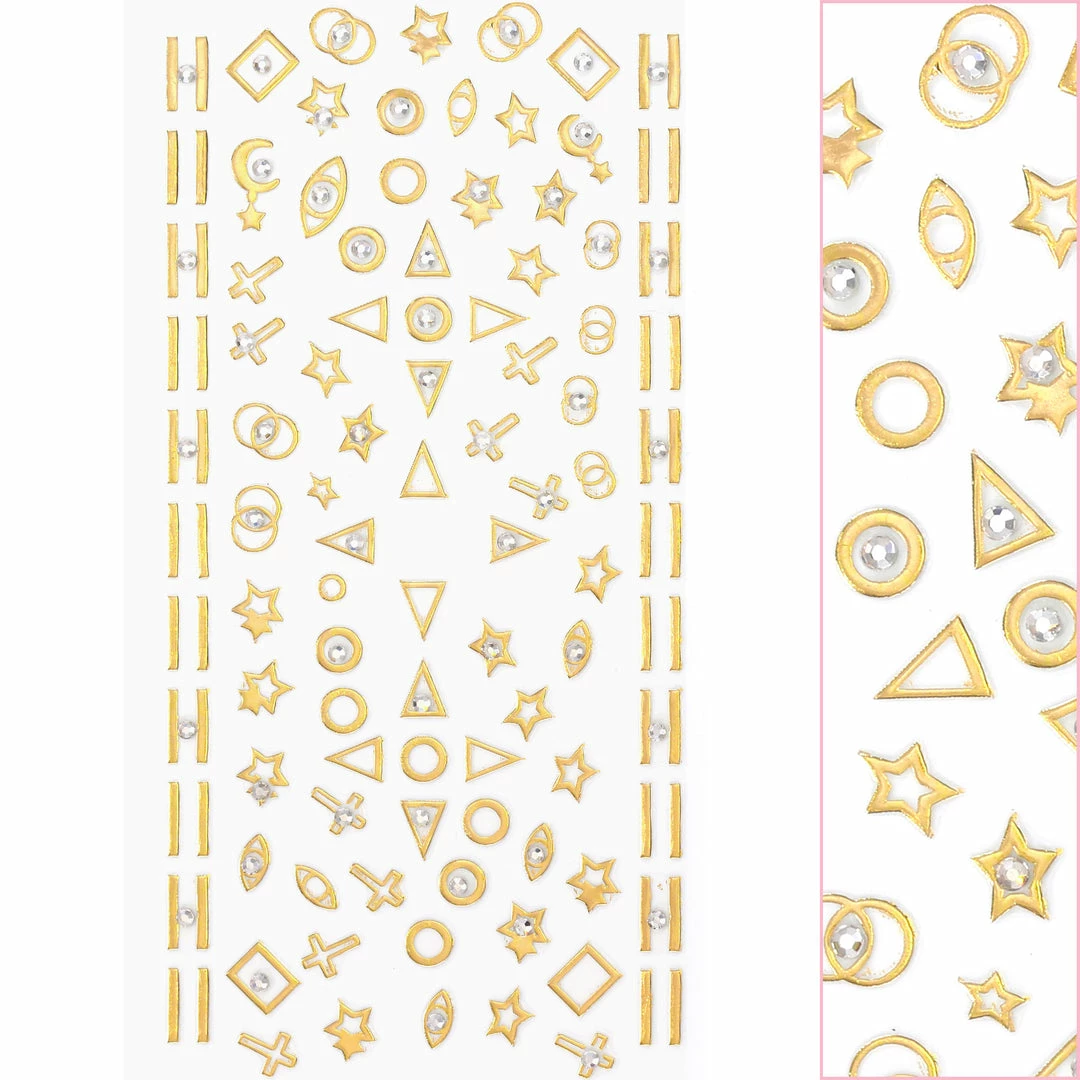Decorate your nails with beautiful golden elements that are bedazzled with crystals! This Mystic sticker include patterns such as lines, rectangles, triangles, crosses, evil eyes, circles and stars. It’s great for adding gold metallic accent and crystals to your unique nail design!