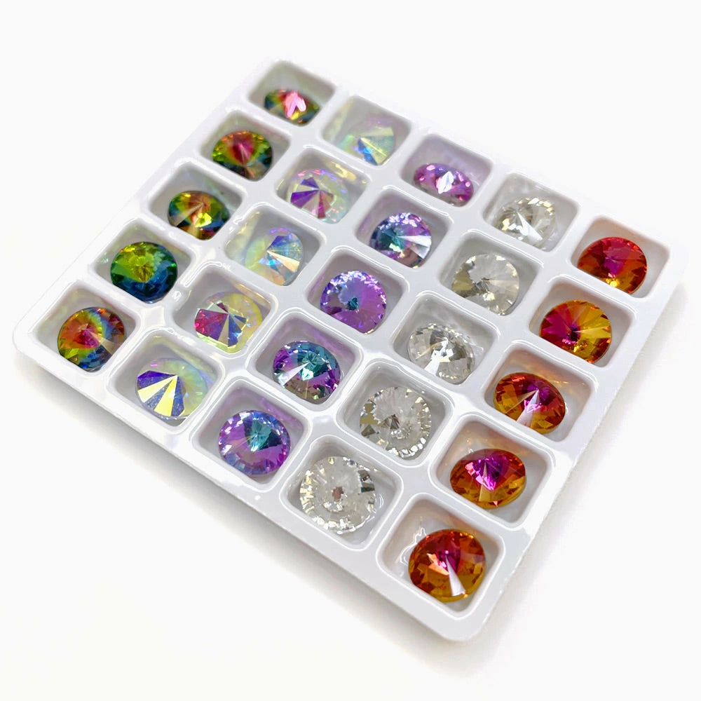 A beautiful mix of round rivoli pointed back chaton crystals that is perfect for creating a mesmerizing gem cluster or a custom charm on the nails!