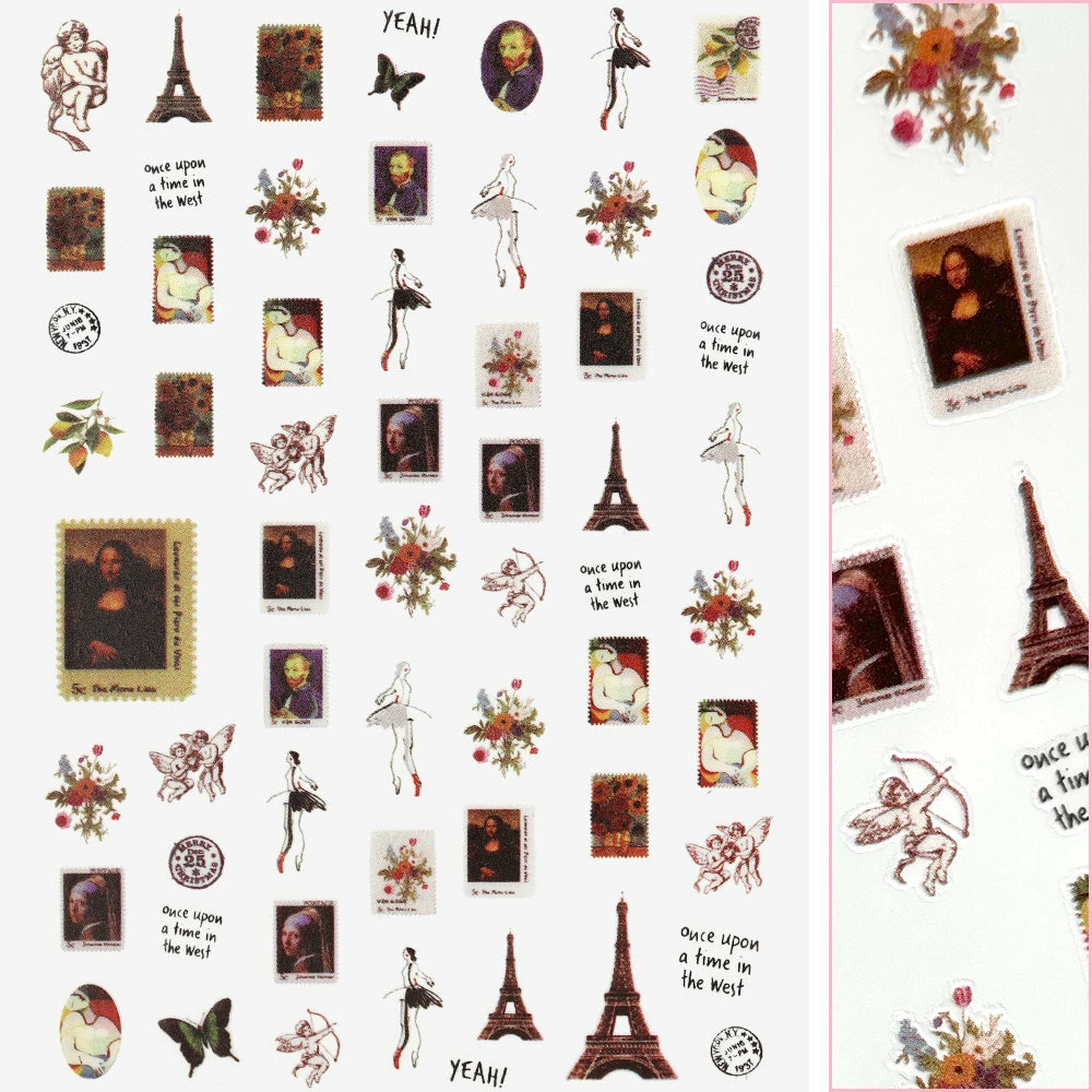 A Parisian themed nail art sticker featuring the iconic Eiffel Tower, artworks and flowers. Easily add a piece of Paris or Van Gogh on your nails with these stickers!