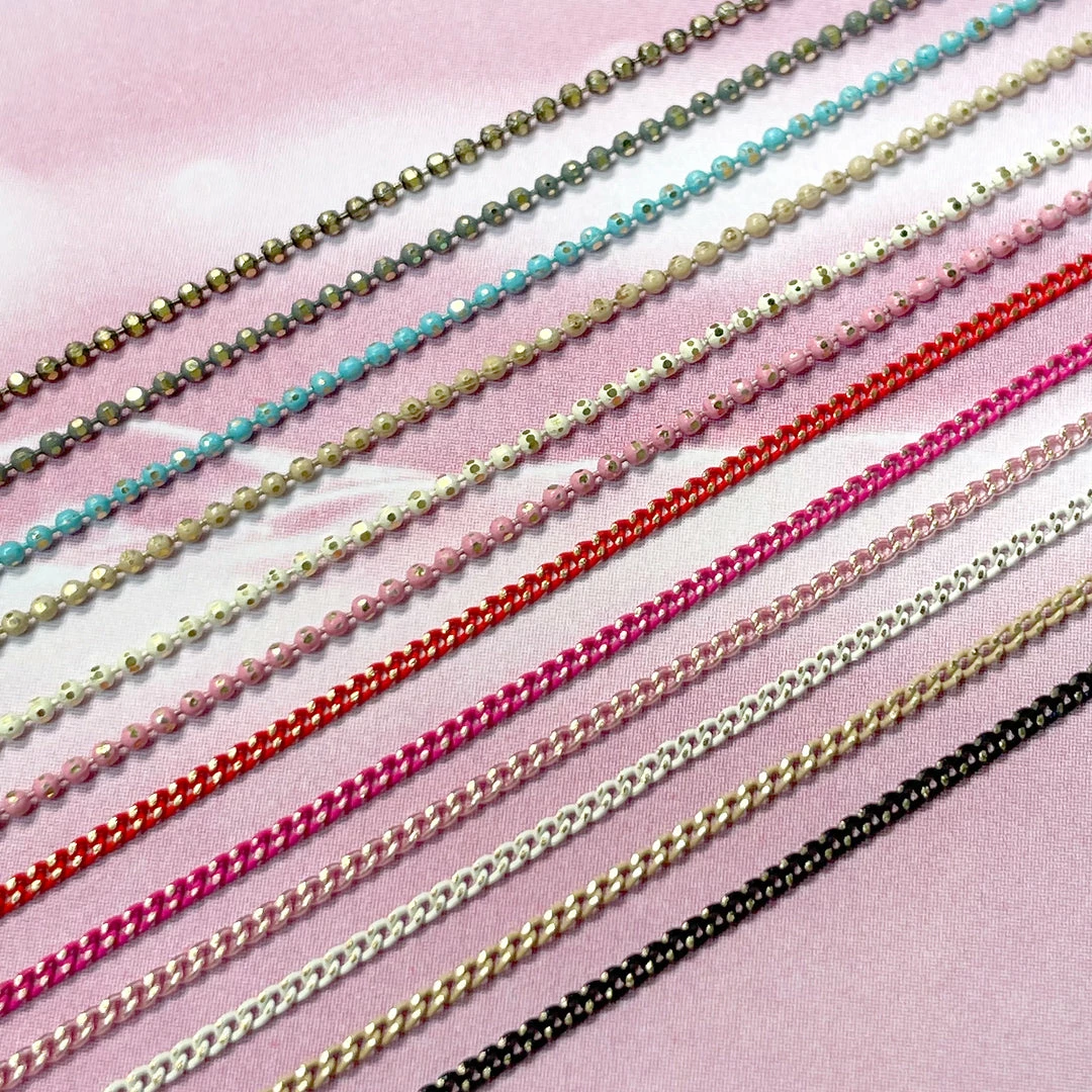 A mix of 6 matte color gold chains and 6 matte color gold beaded chain. Specially picked to be used as nail art decorations and fit on your nails!