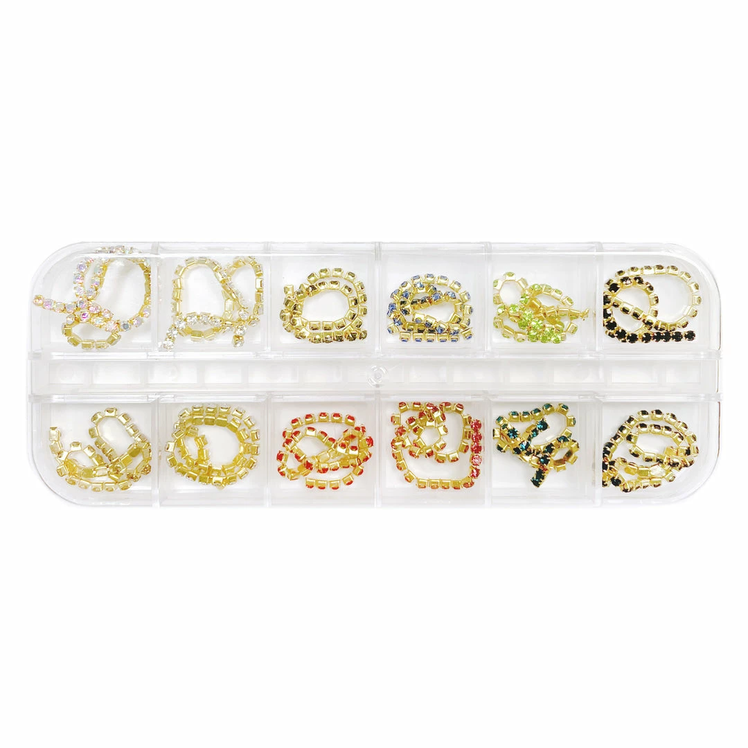 A mix of 12 colorful gold cup chains specially picked to be used as nail artdecorations and fit on your nails! Bedazzle your nails with some glamorous sparkles.