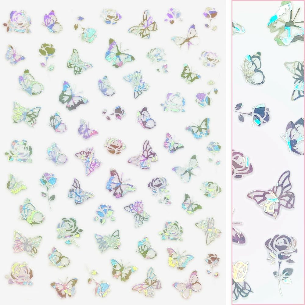 The perfect combination of enchanting roses and butterfly in silver holo for a charming nail design!