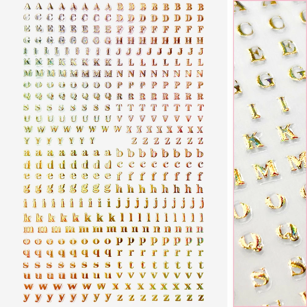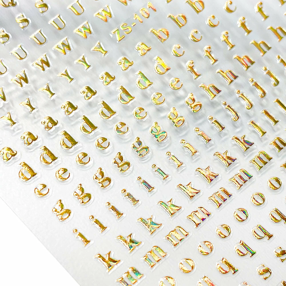 Tiny uppercase and lowercase serif font alphabet letters in holographic gold for nail art! Spell any words you want to send a message on your nails!