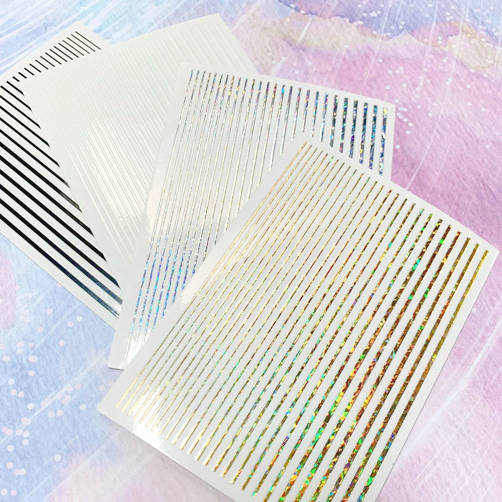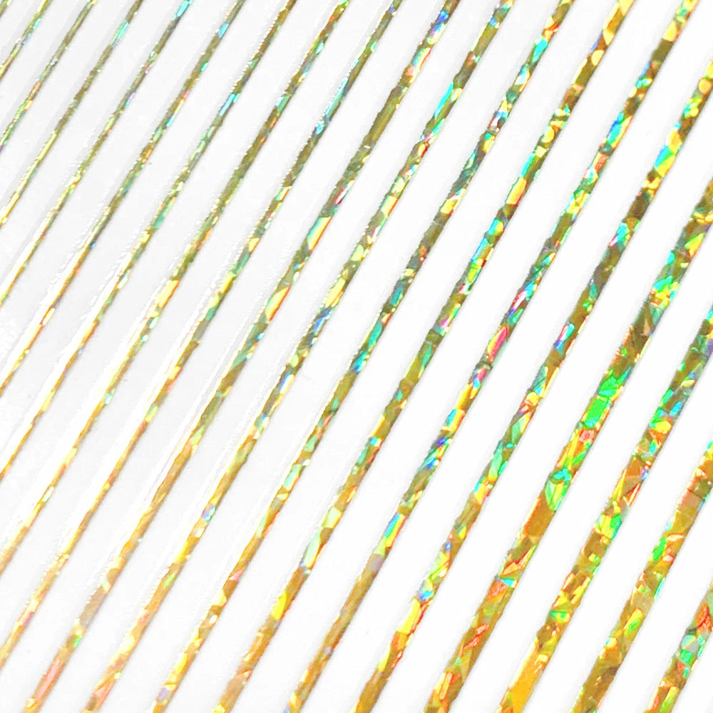 Sparkling Thin Line nail art stickers in holographic gold. This versatile sticker is a great way to add holo gold metallic accent to any manicure. Each sheet comes with different sized fine stripes ranging from 0.5mm to 1.5mm in width, decorate your nails with quality Daily Charme stickers.