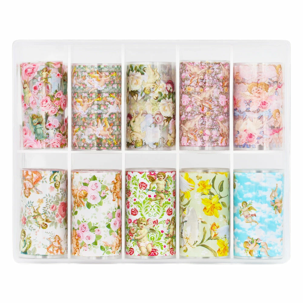 A box of 10 different romantic cupid & floral themed prints. This foil box is a must have for Valentine’s Day nails and any dreamy romantic nail art such as cloud nails. Easily apply foils with our bestselling Foil Transfer Gel!
