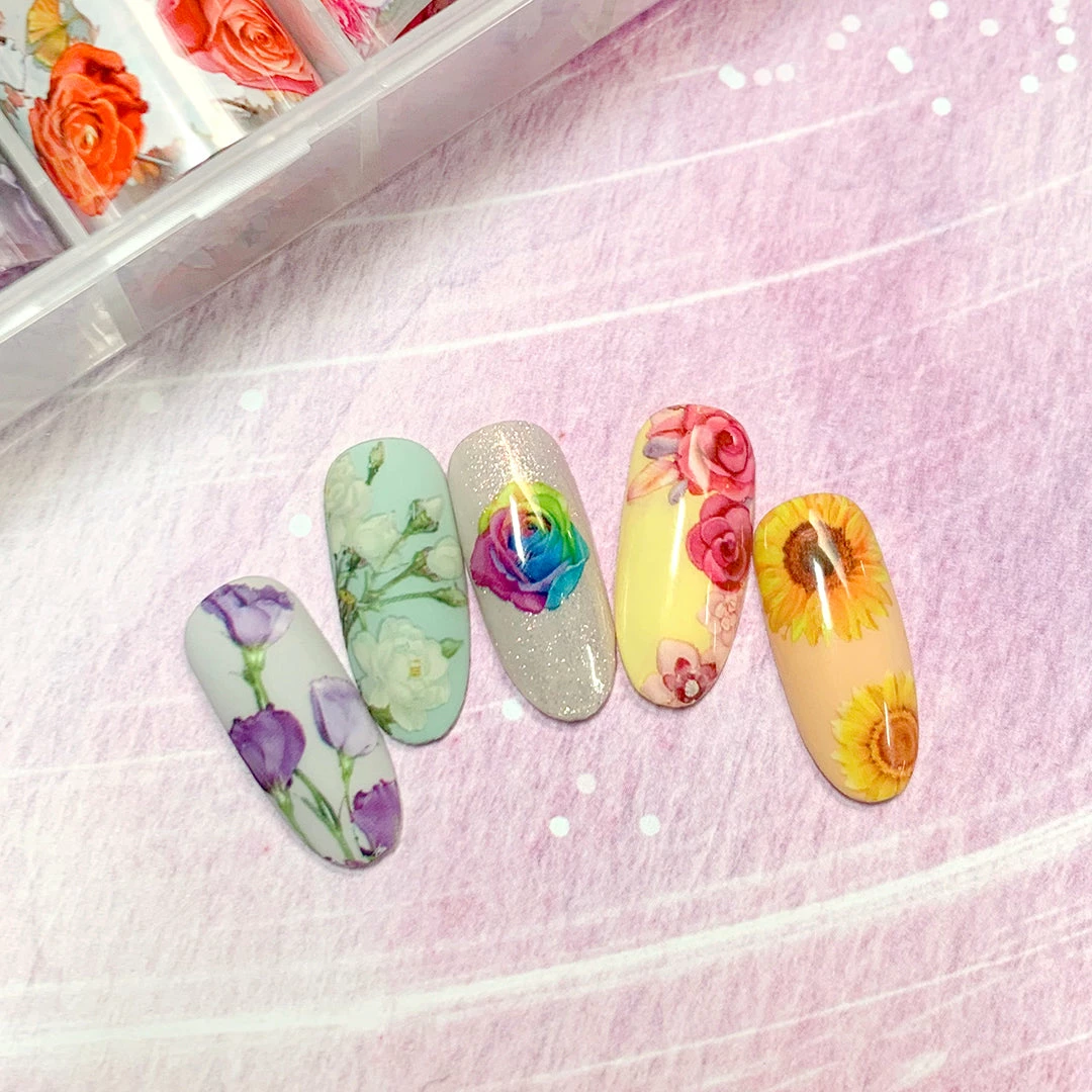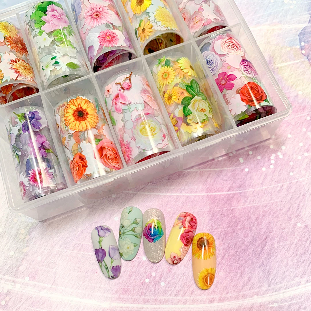 A box of 10 different flower pattern nail art foil papers. Perfect for all flower lovers! This foil box contains a wide array of flowers ranging from daisies, sunflowers, tulips, cherry blossoms, chrysanthemum, iris, angel whispers, lilies, and more. Easily apply foils with our bestselling Foil Transfer Gel!