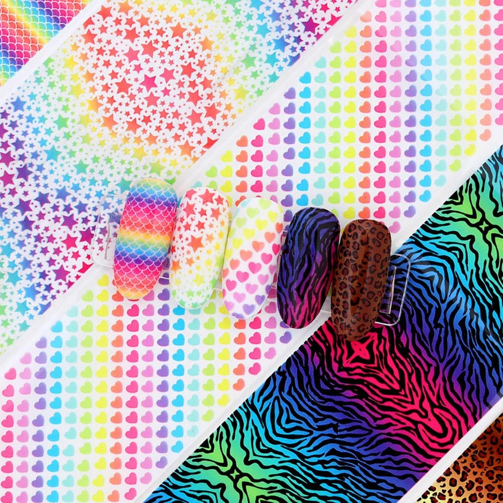 A box of 10 different colorful and bold nail art foil papers. These bright colorful prints include rainbow gradients of hearts, stars, tiger stripes and snakeskin, as well as plaids, leopard print, polka dots and floral prints. Easily apply foils with our bestselling Foil Transfer Gel!