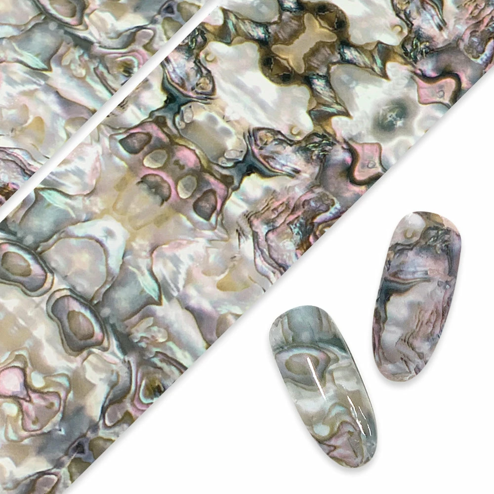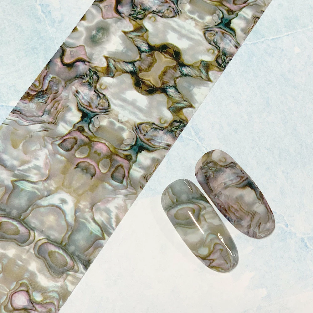 A beautiful foil print made to look like the nacre or mother-of-pearl of natural shells! Foil transfer is an easy way to add full coverage or accent nail art to your nails.