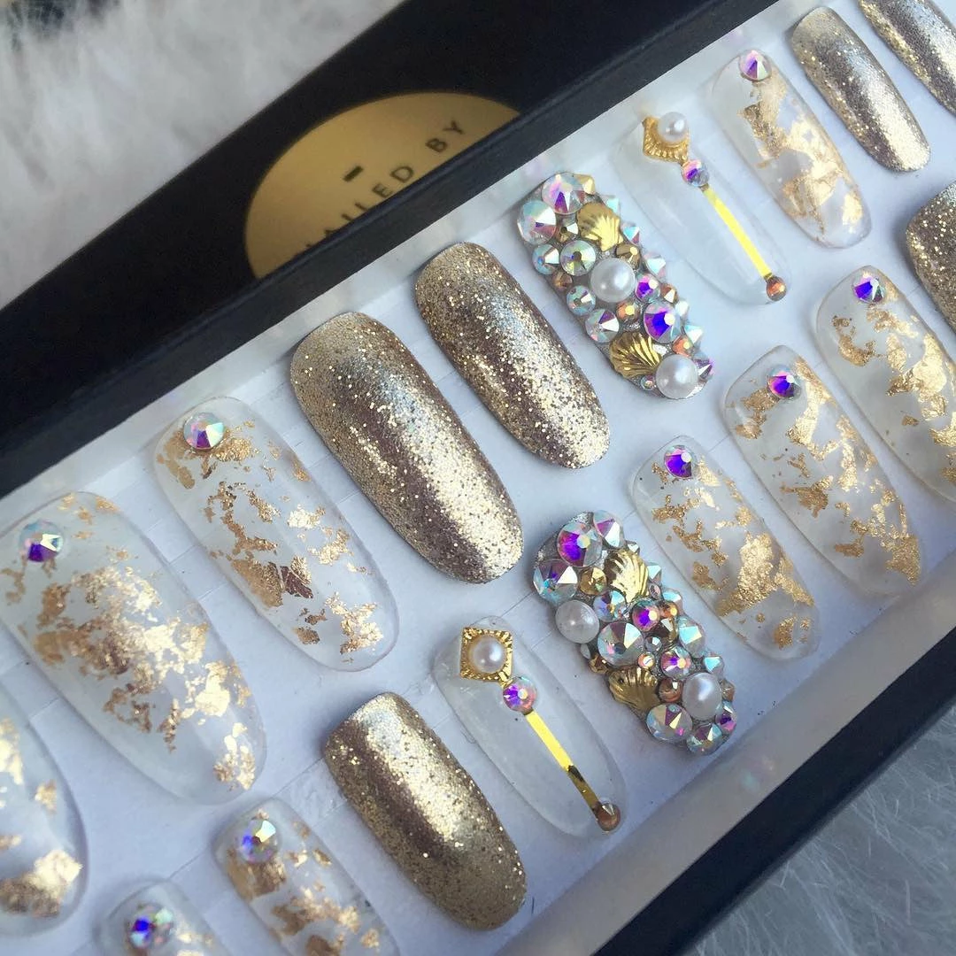 They can be embedded into acrylic / gel, or simply placed on top of slightly tacky nail polish and sealed off with a top coat.