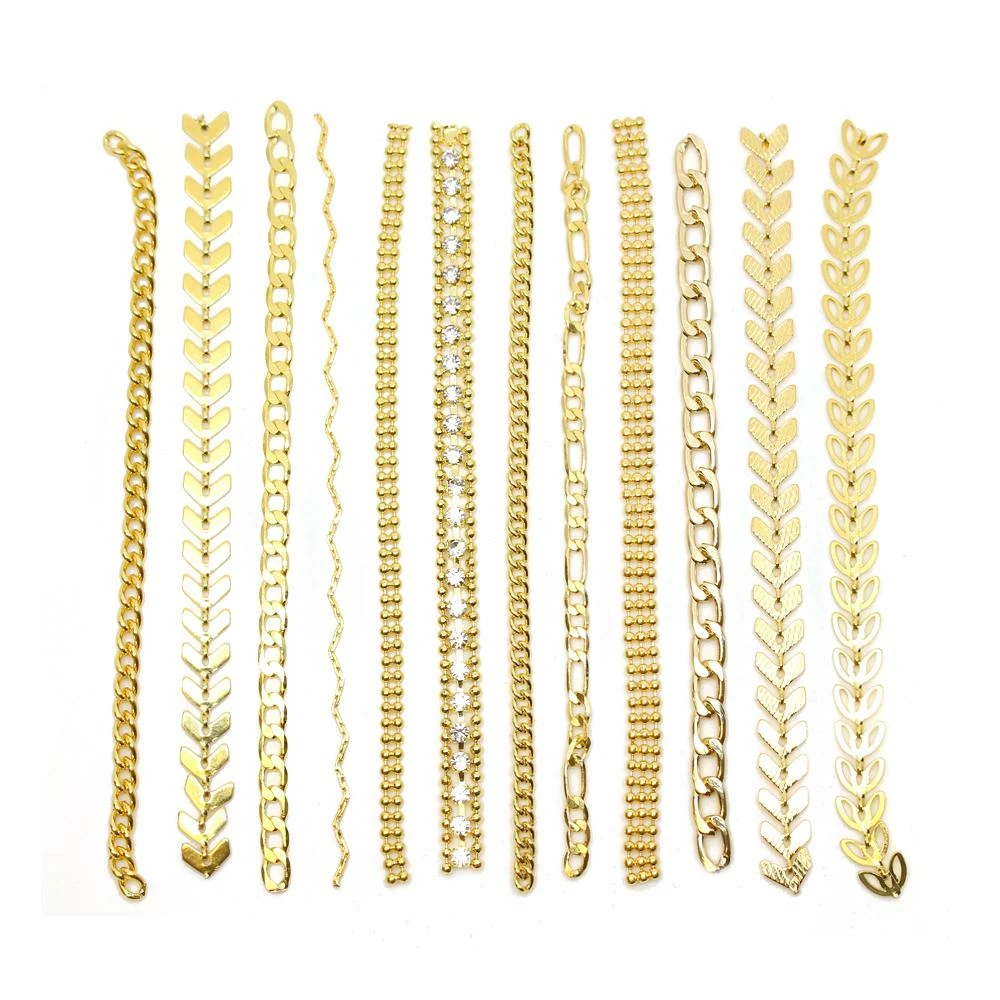Set of gold decorative chains in 12 different designs. Specially picked to be used as nail art decorations.