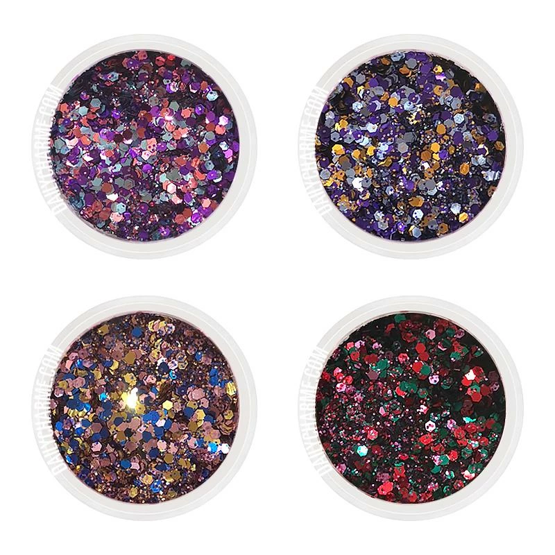 A set of metallic hex glitter mix in 4 different dark fun confetti colors, inspired by a whimsical Halloween party scheme. These glitter are great in quality, they can be used with nail polish, gel or acrylic.