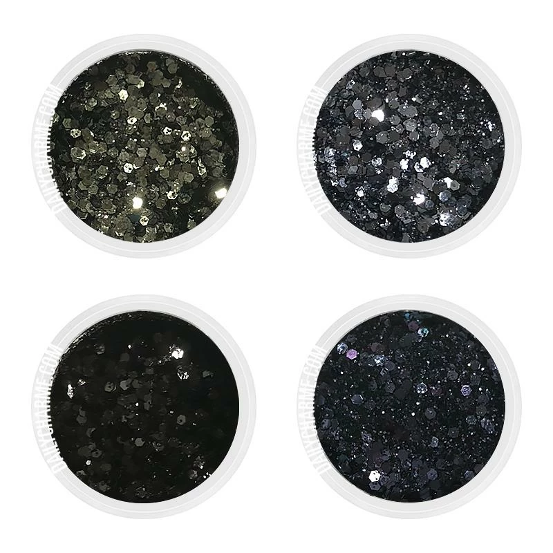 A set of metallic hex glitter mix in 4 different dark shades, inspired by fairytale villain Maleficent. Dark but shiny black and gunmetal glitters for fall or Halloween nails! These glitter are great in quality, they can be used with nail polish, gel or acrylic.