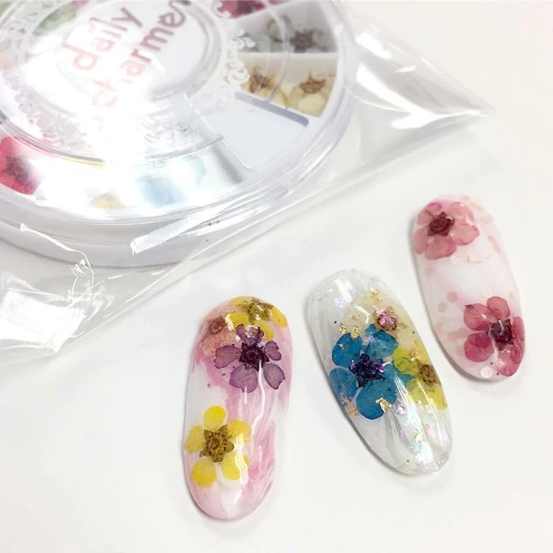 A box set of pressed real 5-petal flowers in 12 different colors with 5 pieces of each color. Specially picked to be used as nail art decorations. These dried flower petals are hand-dyed, each piece is unique and beautiful on its own.