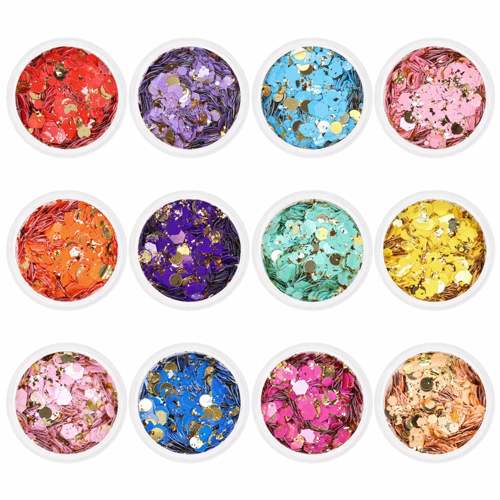 Brightly colored hex glitters mixed with gold dots and flakes in 12 different shades, this glitter set is perfect for colorful summer nails!