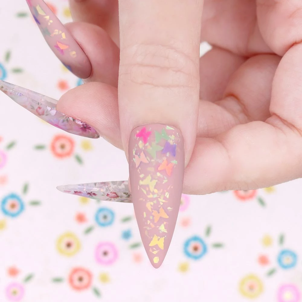 This beautiful Iridescent Butterfly Glitter Mix in Floral Blossoms is perfect for adding shiny butterflies to your nails, embed it in clear gel or acrylic nails for that subtle rainbow sparkle. UIt can be used with nail polish, gel or acrylic.