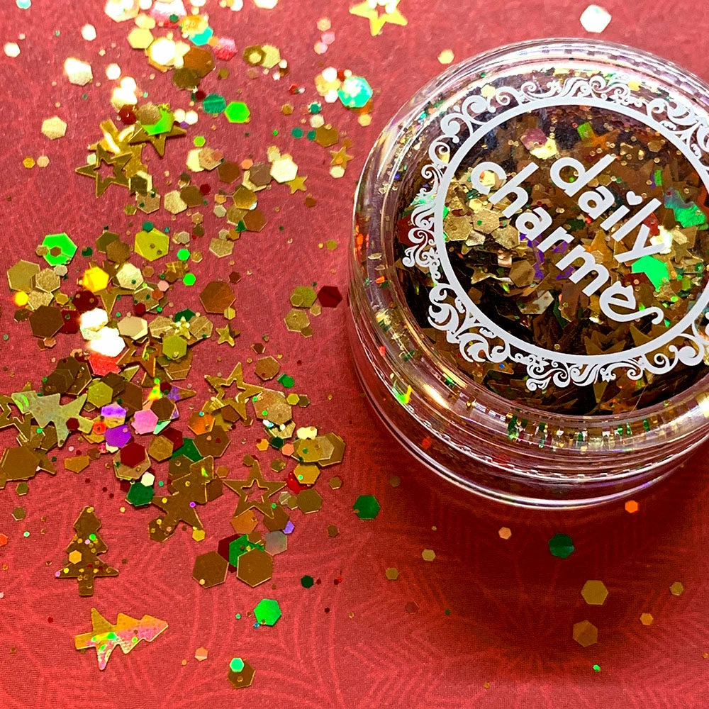 Festive Holiday Christmas Tree is a mix of brilliant gold, red, green holographic hex, star and Christmas tree glitters! Perfect for fun Christmas nails. Can be used with nail polish, gel or acrylic.