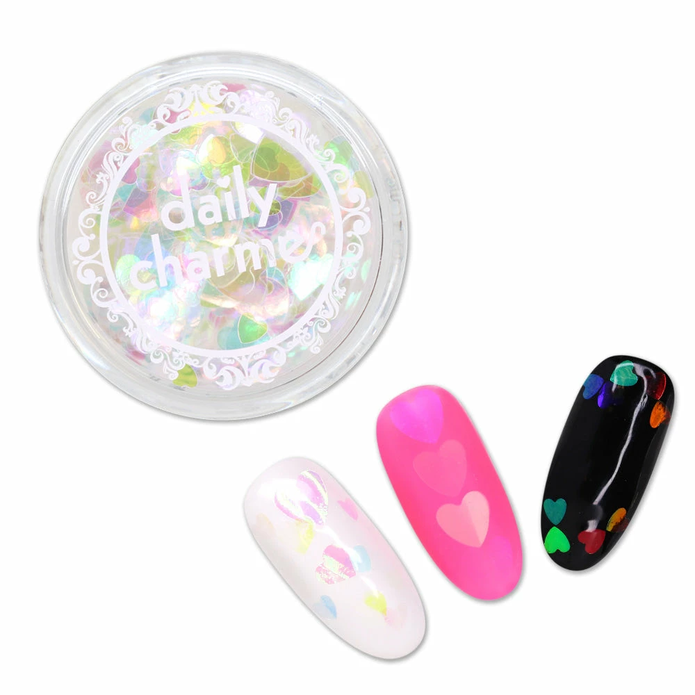 A cute mix of colorful iridescent transparent heart glitters in different sizes. Size includes 3mm, 4mm and 6mm. Add these heart bubble-like glitters to your Valentine’s Day nails!