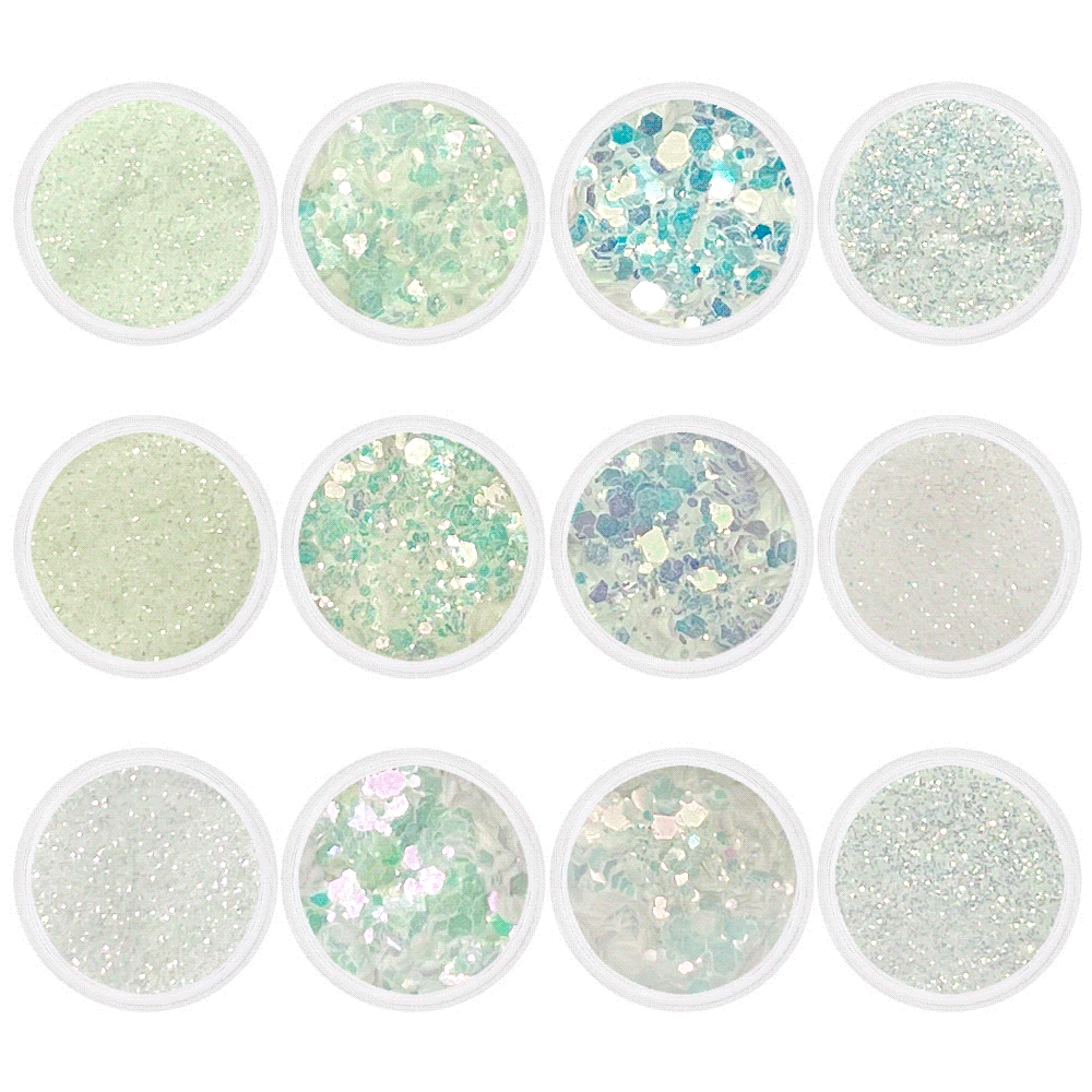 Each set comes with 12 different colors/glitters and are contained in 5-gram jars.