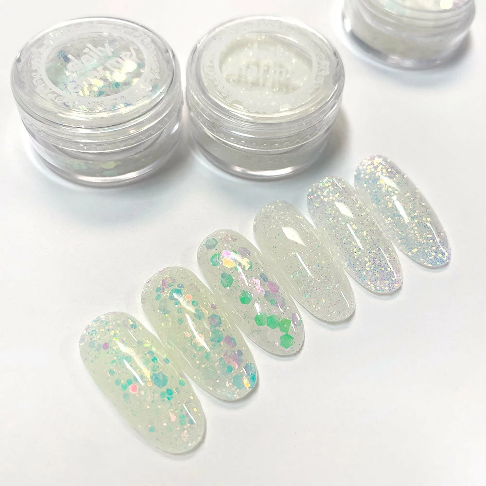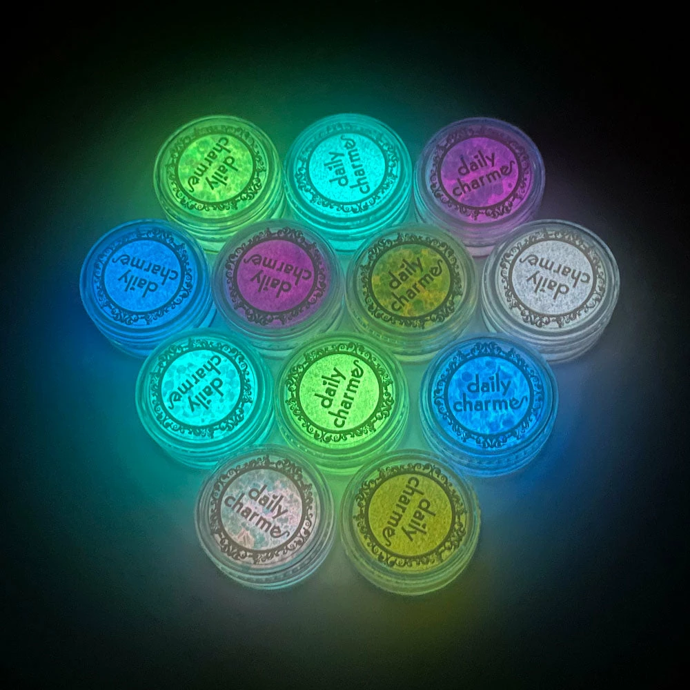 A set of magical glitter mix that is both iridescent AND glows in the dark! This set includes iridescent glitters in mixed hex and glitter dust sizes. The mesmerizing fairy dust like glitters are mixed with 6 different color glow pigments to create the best effects. Glow colors include white, purple, blue, cyan, green and lime.