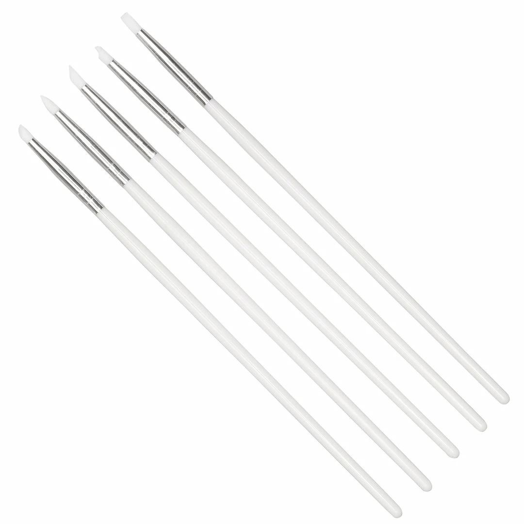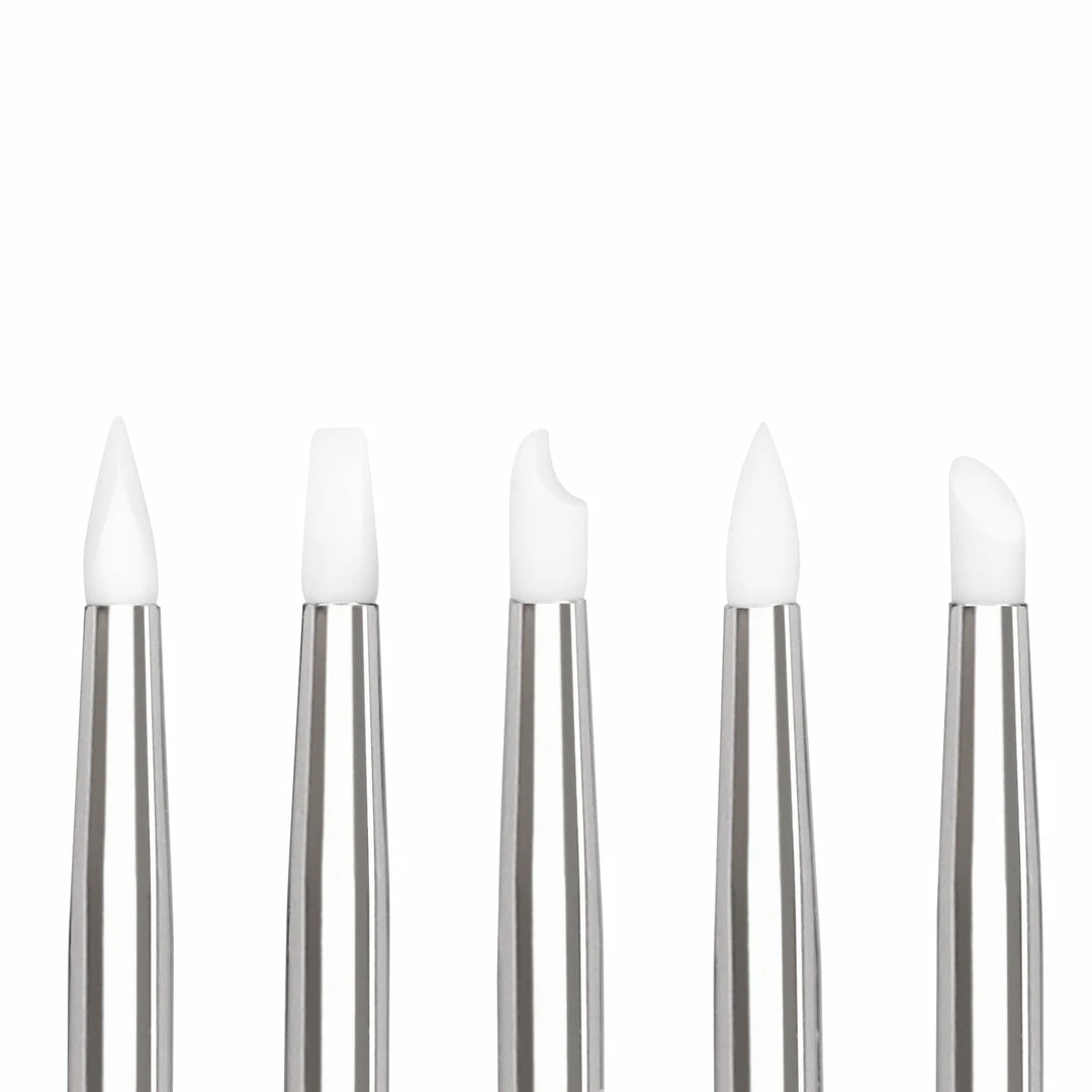 A set of 5 silicone brushes with different tip designs. Great for sculpting gel or acrylic 3D nail art designs, applying nail decors or cleaning up gels. The silicone tips make it really easy to clean, just use alcohol!