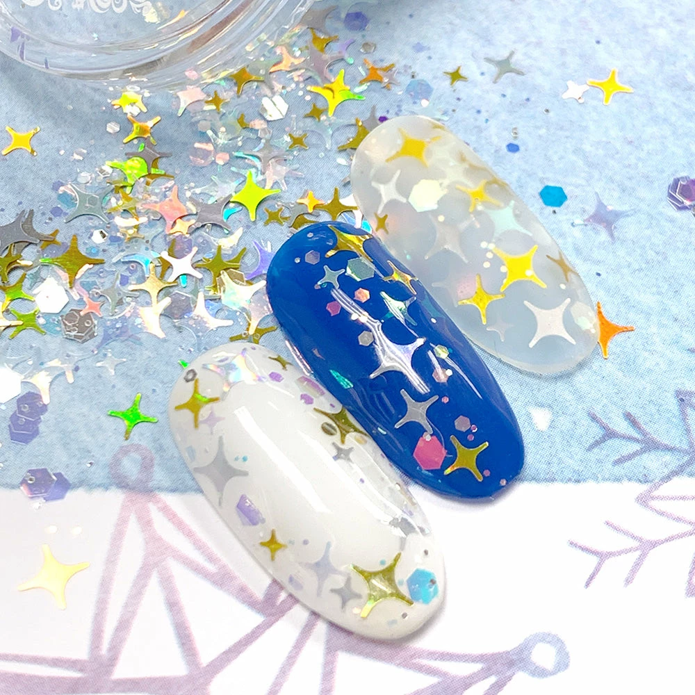 New Year’s Eve firework inspired mix of iridescent and holographic star sparkle glitters. Perfect for holiday and winter season nail art! Can be used with nail polish, gel or acrylic.
