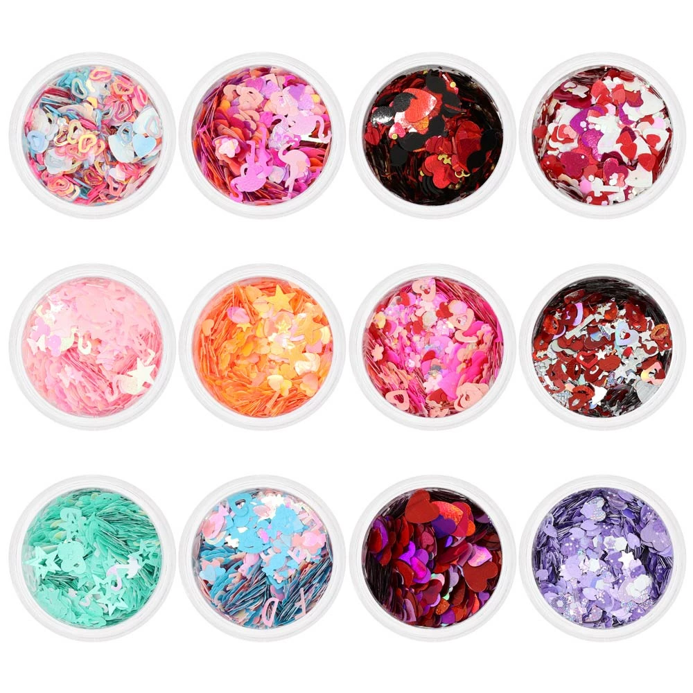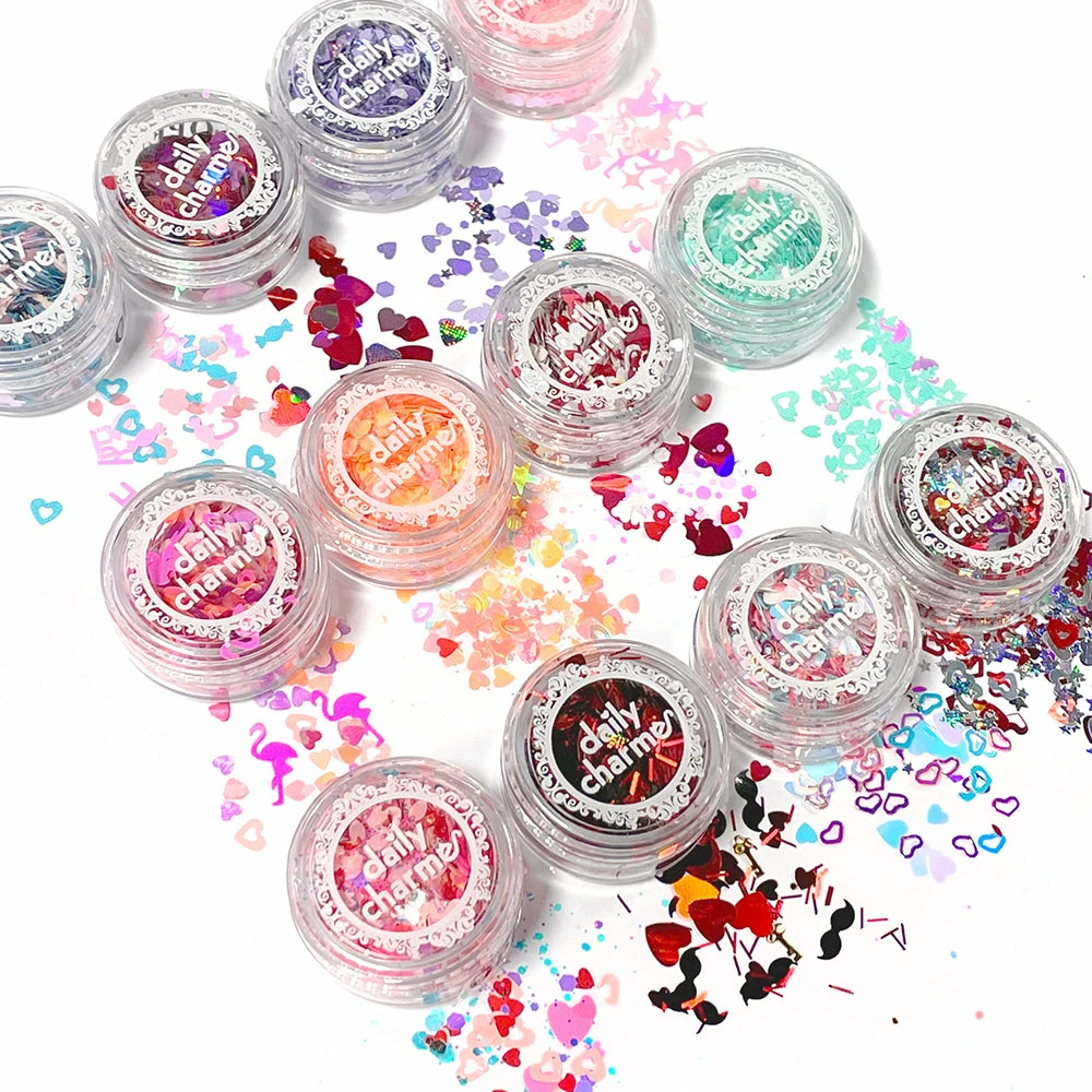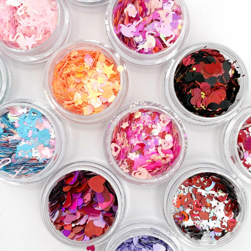 A collection of fun shaped heart glitter mixes to add colorful and bold sparkles to your nail art! This glitter set includes a large variety of holographic, iridescent and matte shapes in hearts, hex, flamingo, candy, stars and alphabets! Perfect for a fun Spring or Summer manicure!
