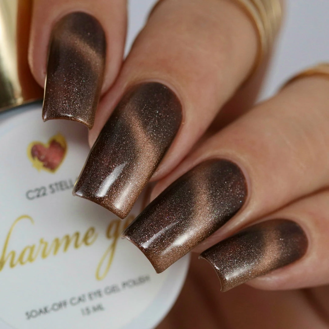 C22 Stellar – A dark beige brown with subtle iridescent sparkles that reminds us of the space between stars. Fall in love with this cozy and unique cat eye color this autumn!