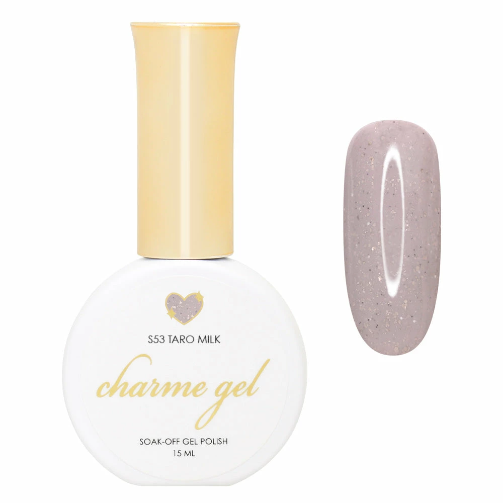 S53 Taro Milk – A pale dusty purple creme with subtle golden shimmers and tiny sand-like speckles. Pair it with a matte top coat for a perfect natural stone finish.