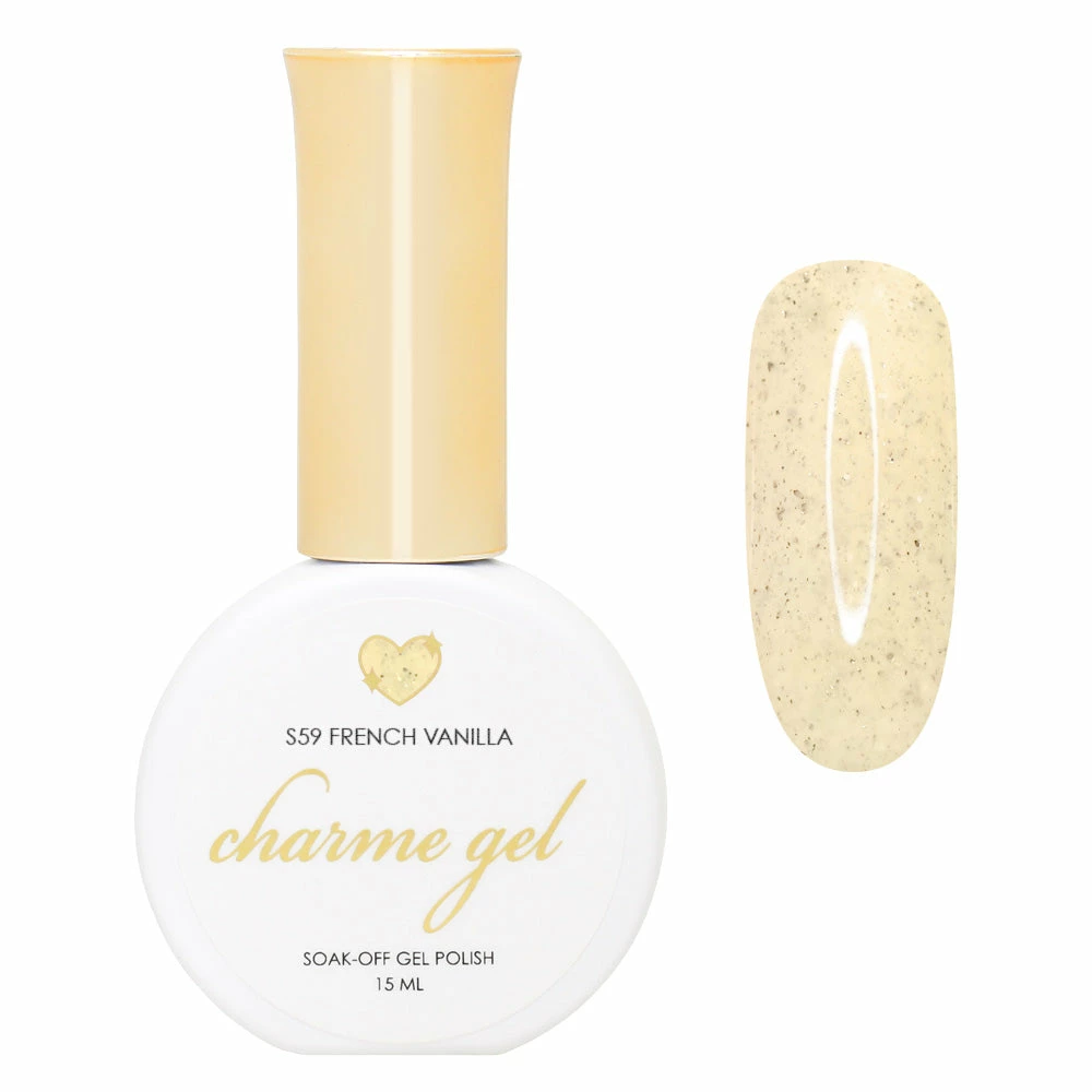 S59 French Vanilla – Soft pastel yellow creme with subtle golden shimmers and sand-like speckles. It’s a great spring and summer color, use it to create eggshell nails or pair it with a matte top coat for a perfect natural stone finish.