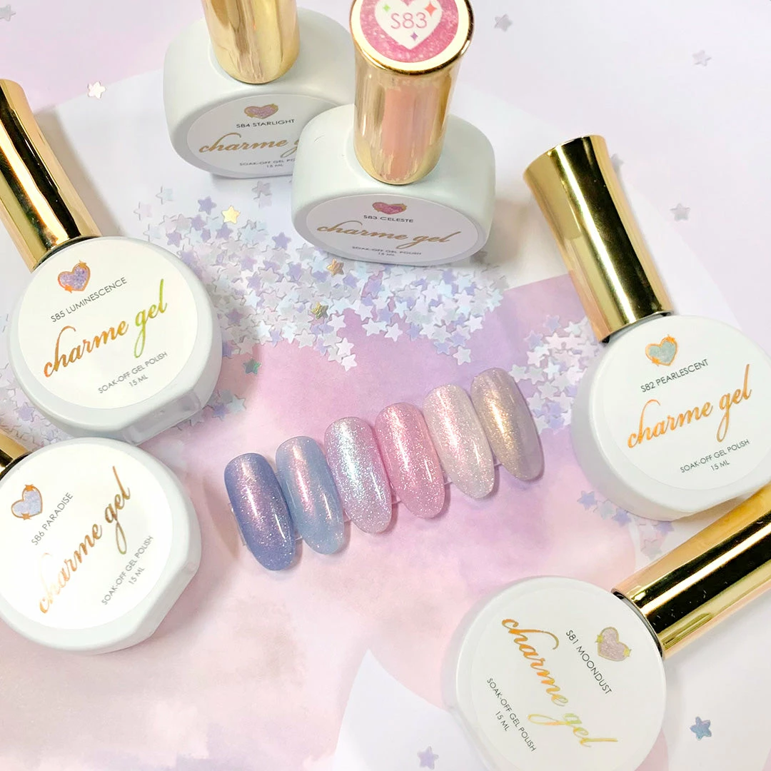 S83 Celeste – A light pink jelly gel packed with mesmerizing pink toned micro iridescent flakes! Pretty with just one coat for a sparkling iridescent finish, or 2-3 coats for a more opaque effect. These beautiful shimmer gels can be layered over other colors to add iridescent sparkles to any manicure!