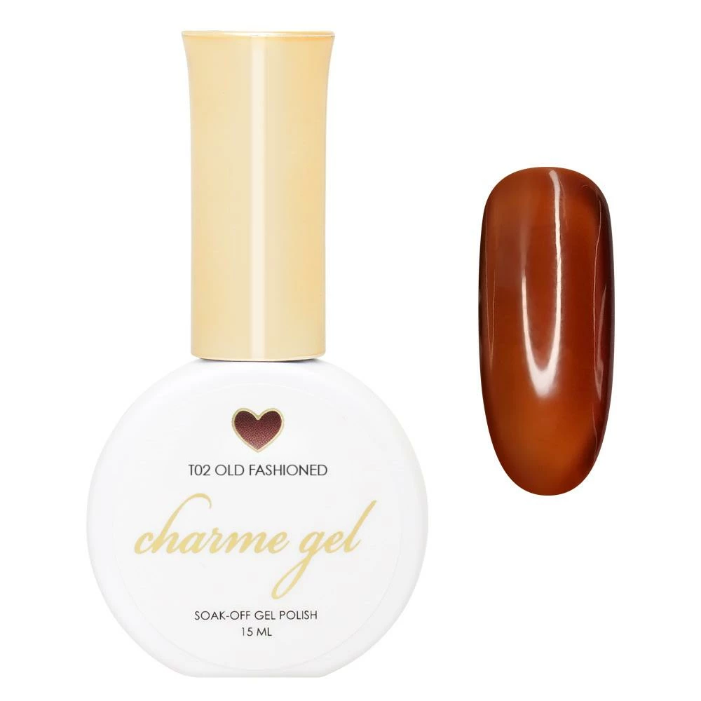 T02 Old Fashioned – From our Tinted Glass Gel collection, this transparent dark brown polish is the perfect color for autumn, use it to create amber or tortoiseshell nails.