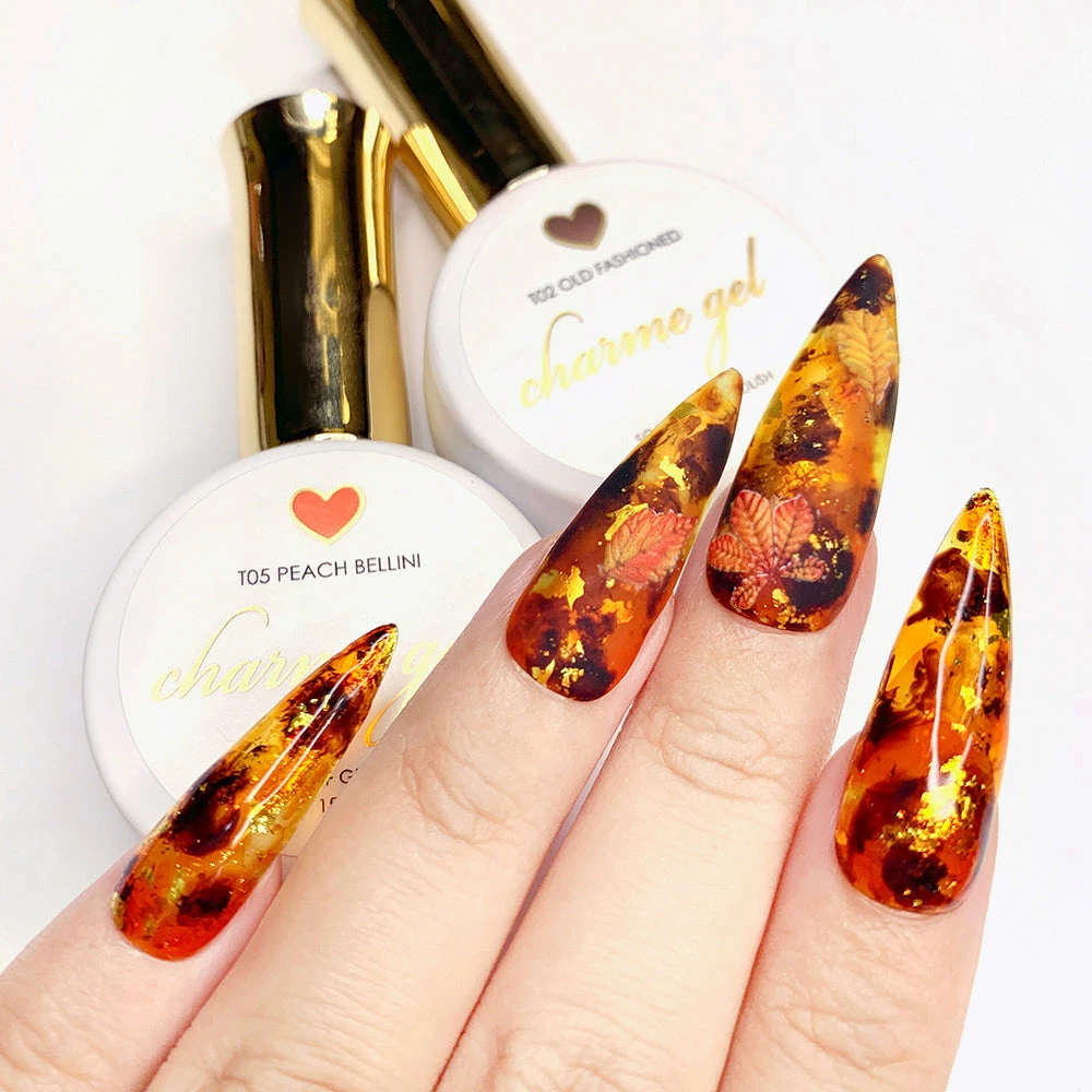 T05 Peach Bellini – From our Tinted Glass Gel collection, this transparent orange color is perfect for summer and fall nails! Pair it with T02 Old Fashioned to create tortoiseshell and amber nails.
