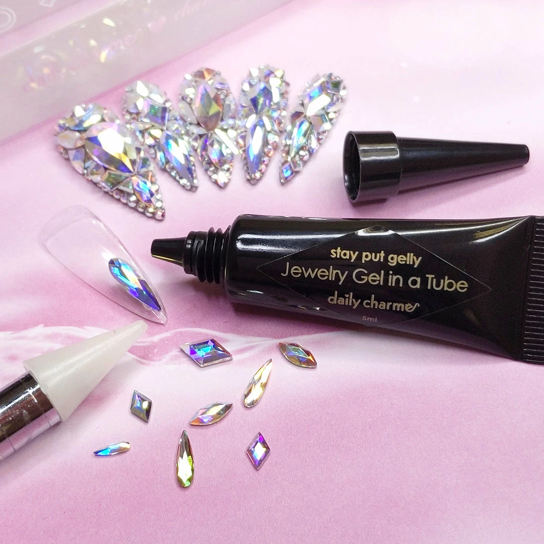 Stay Put Gelly is perfect for securing nail charms, Swarovski crystals and other nail embellishments to your nail. Unique viscous texture allows the gem pieces to stay put during the curing process, you won’t have to worry about them sliding out of place. Use it to create gem clusters or to add crystals and charms to your nails!
