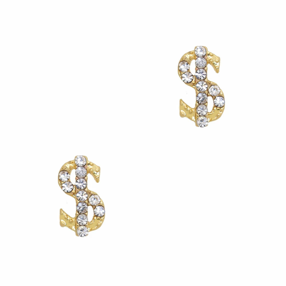 Gold bling money sign symbol nail charms with sparkly crystals. These beautiful 3D nail charms are the perfect accessories to your manicure! Slightly curved on the back to fit nicely on the nails.
