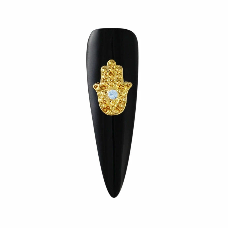 These gold Evil Eye Hamsa charms with rhinestones are symbolic of the hand of god and protection. Include these symbolic jewelry in your next manicure for a mysterious look!