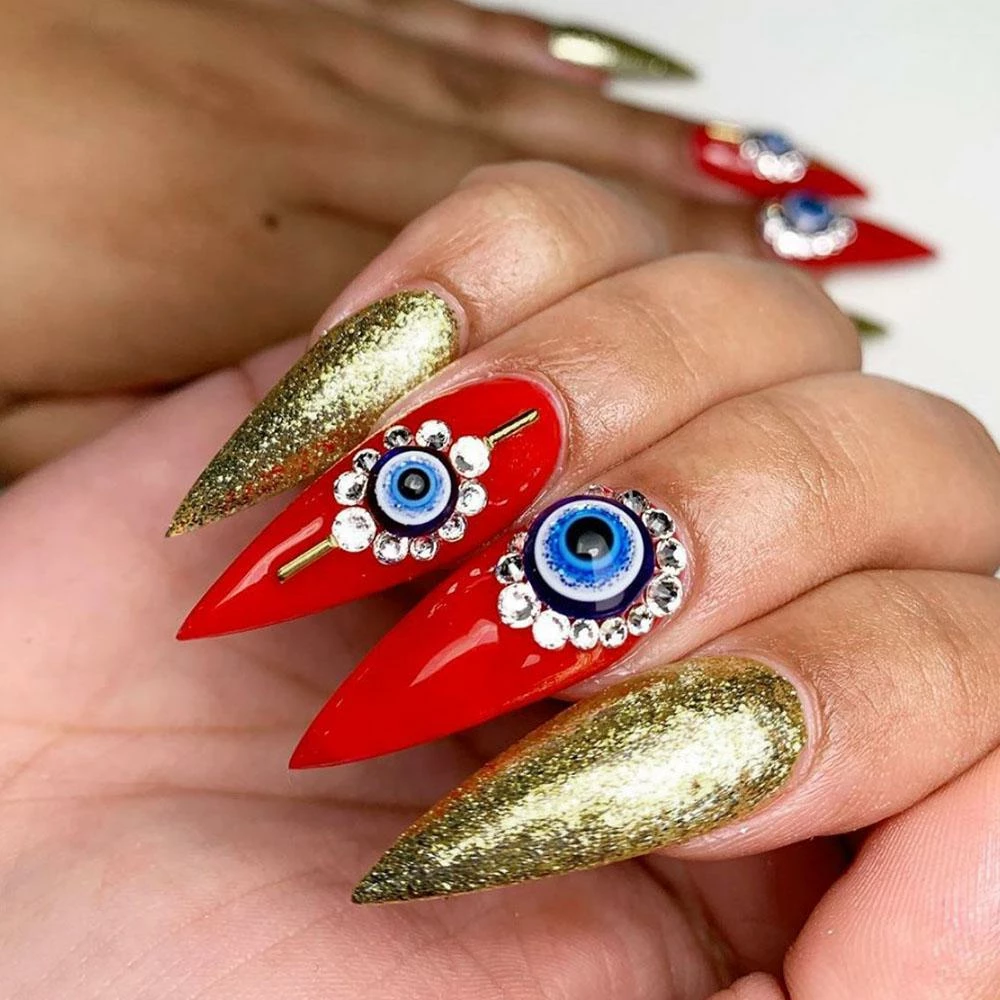 Unique blue glittery evil eye nail decors that you can put on your nails as a good luck charm to protect yourself from evil spirits! Can also be used to accent a hand painted hamsa or Halloween nails.