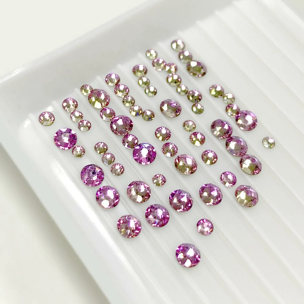 Authentic Swarovski Round Flatback Rhinestones in VITRAIL LIGHT – a rare fuchsia, purple color shift crystal with a hint of faded green. The unique coating gives these crystals a dazzling chameleon look!