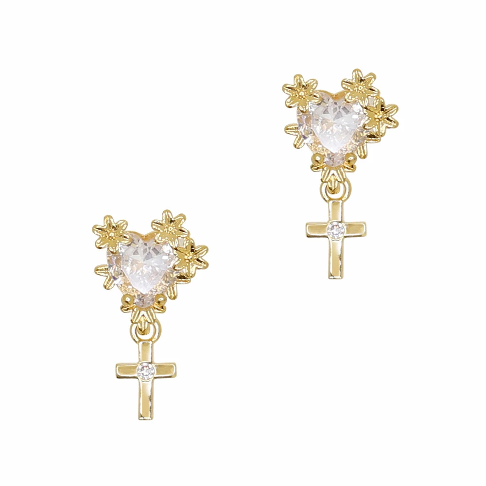 A beautiful sparkling zircon stone heart framed by delicate tiny golden flowers with a small cross dangle. This dangle charm is perfect for extravagant wedding nails and lovely Valentine’s Day nails.