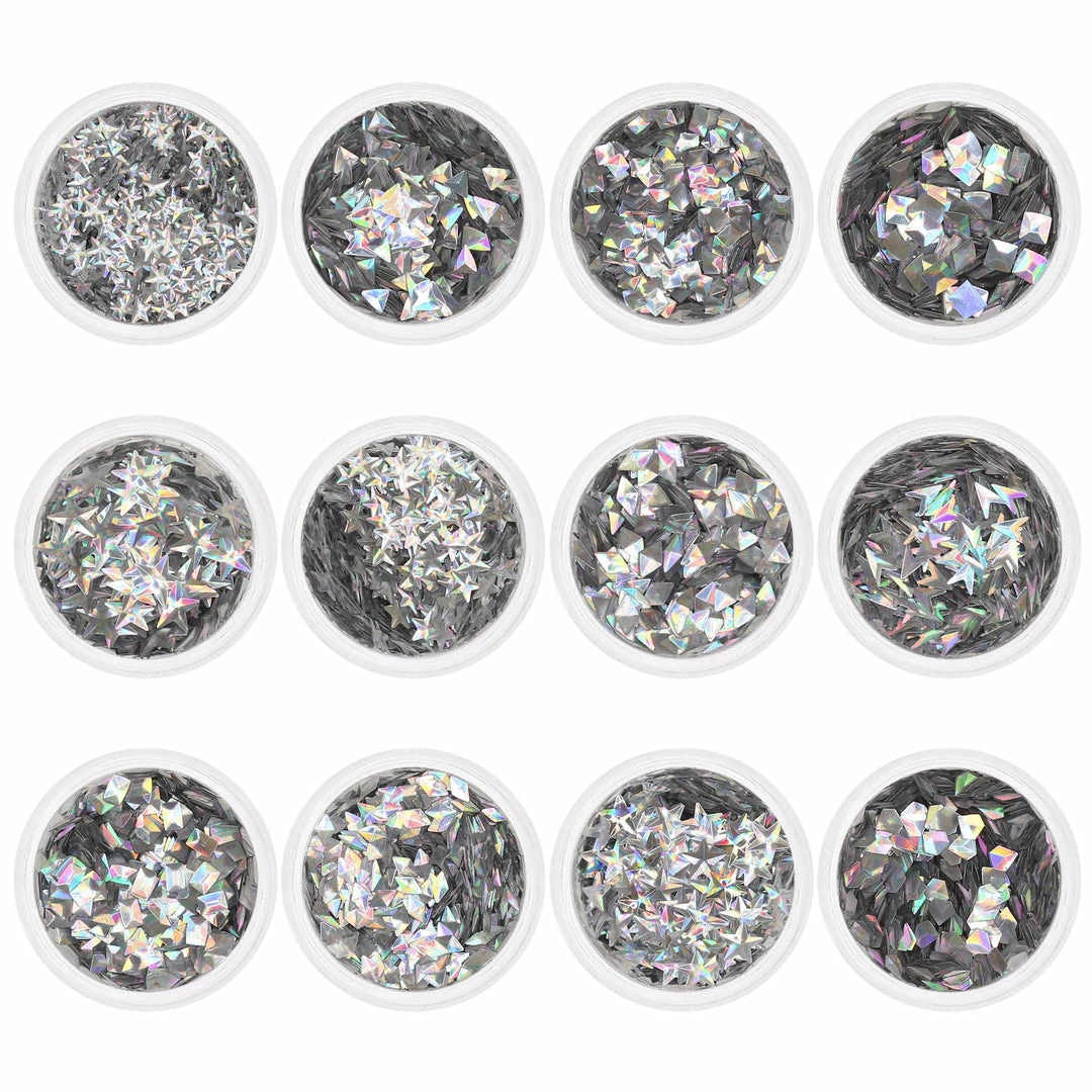 A set of silver holographic 3D embossed glitters in various fun shapes including star, square, rectangle, arrow, diamond, triangle and rhombus. These embossed glitters have more facets which makes them shinier, they’re perfect for adding a little holographic sparkle to any nail design!