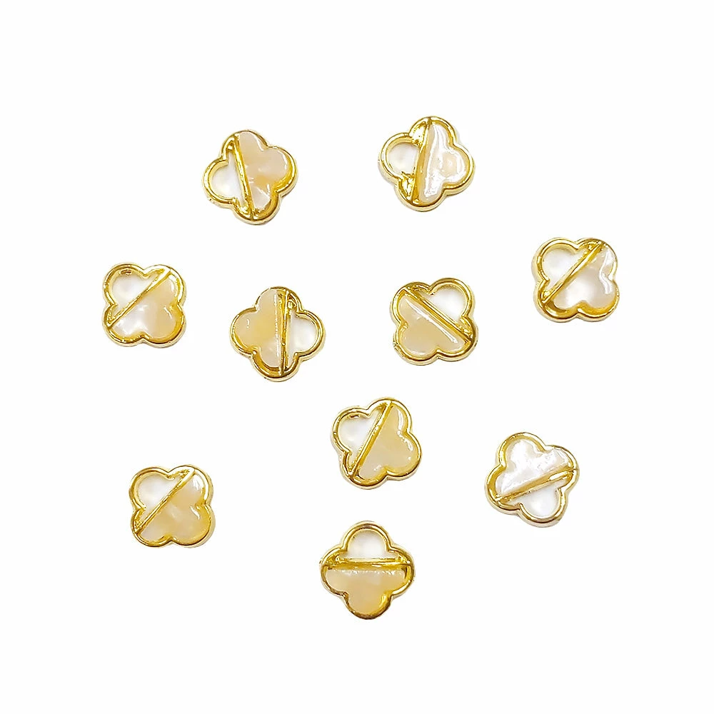 Flatback gold framed resin gem clovers in mother of pearl pattern. These chic nail gems are versatile and easy to use!