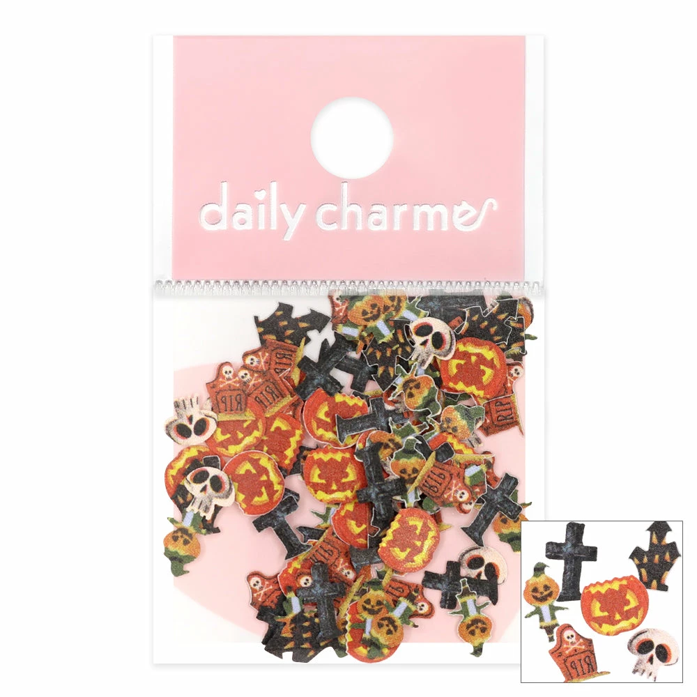 A paper glitter mix of jack o’ lantern, skulls, tombstone, cross status, scarecrow, and haunted house. Have some fun on your nails this Halloween season!