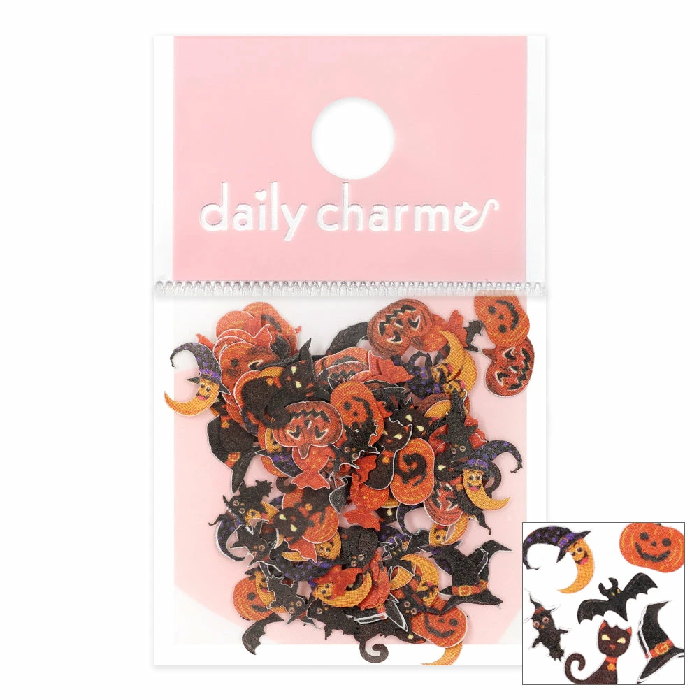 Super cute paper glitter mix of classic jack o’ lanterns, black cat, bat, owl and candy. Easily dress up your nails for Halloween with these nail decors!