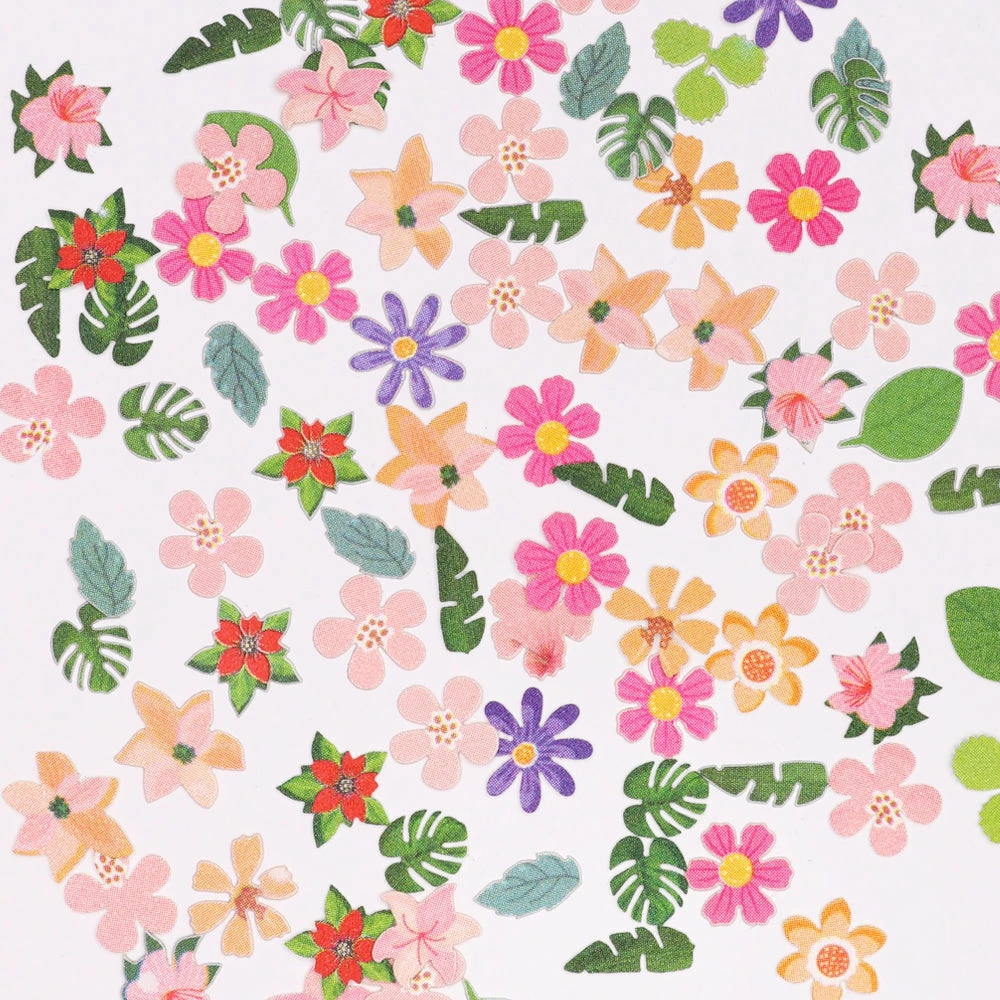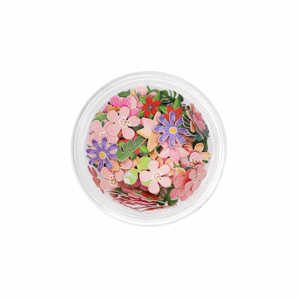 Colorful flowers and green leaf paper glitters for nail art. These soft and thin paper glitters can be easily bent to create a curve to fit nicely on the nails. This mix includes pink, purple, orange, red flowers with tropical plants like monstera and banana leaf. Sizes range from 5mm to 10mm.