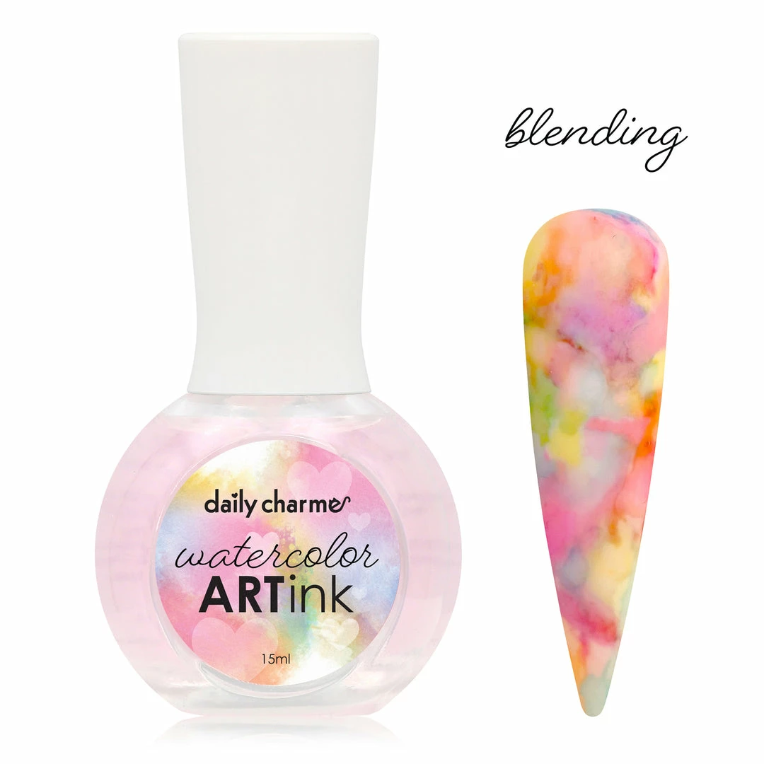 Daily Charme Art Ink is perfect for creating artistic watercolor style nail designs and is specially formulated to be fast drying and highly pigmented. It can be directly applied over acrylic nails, cleaned tack-free gel polish or matte topcoat.