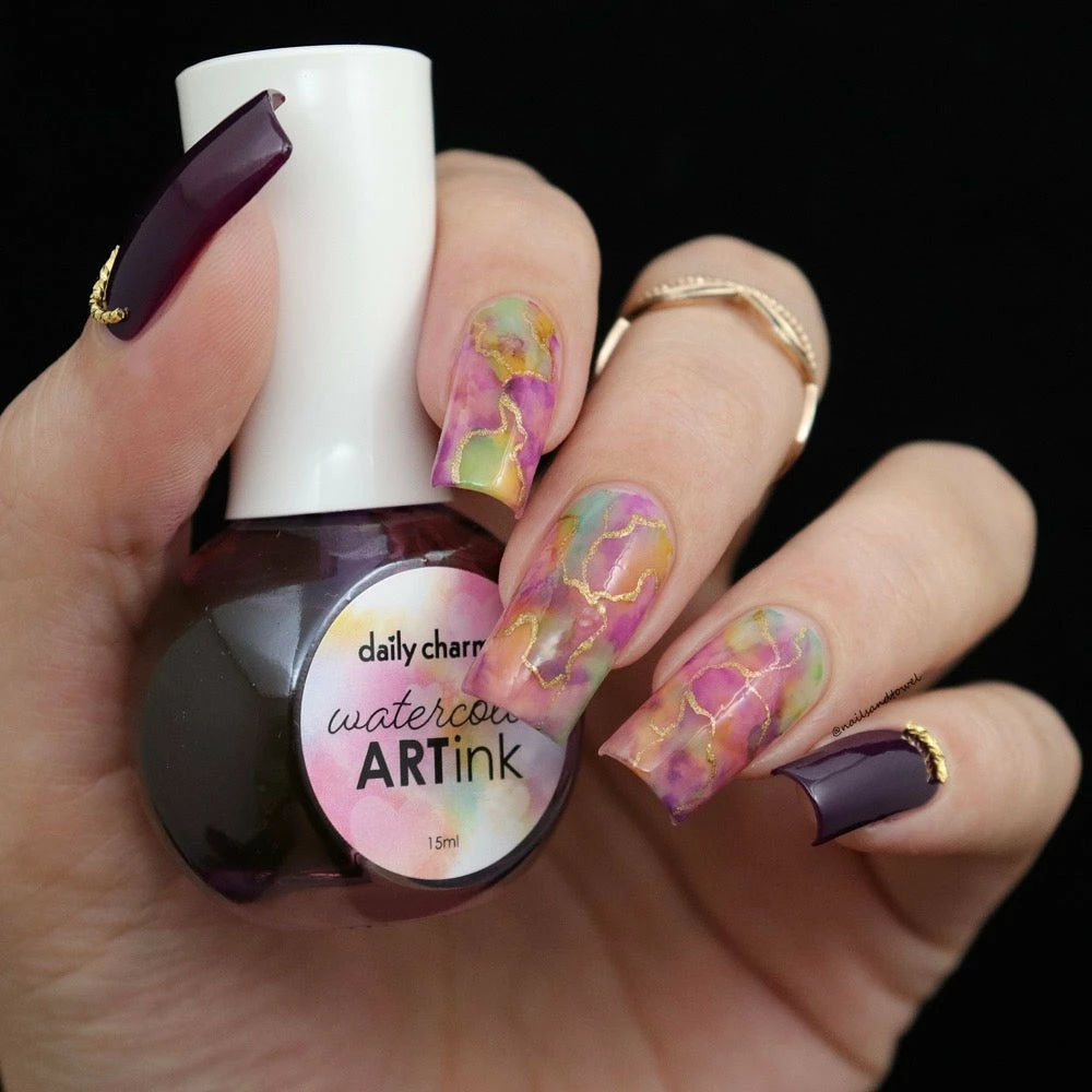 Daily Charme Watercolor Art Ink is perfect for creating artistic watercolor style nail designs and is specially formulated to be fast drying and highly pigmented.