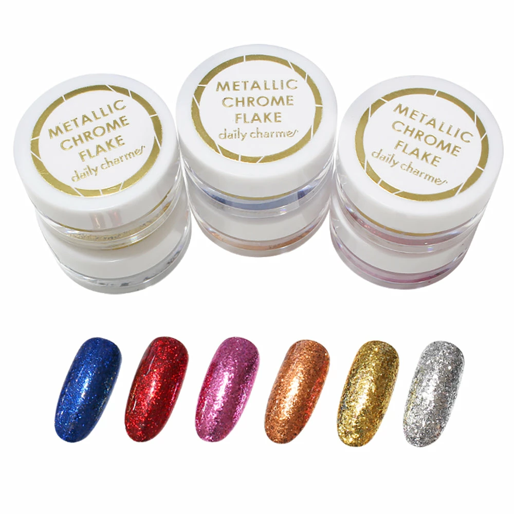 Chunky metallic flakes that can be used to add metallic texture to your nails. The Metallic Chrome Chunky Flakes can also be applied over no-wipe gel top coat for a colored metallic chrome finish; no tinted gel required! These flakes are ultra thin and sparkly so they’ll be a great upgrade from regular nail art foils.
