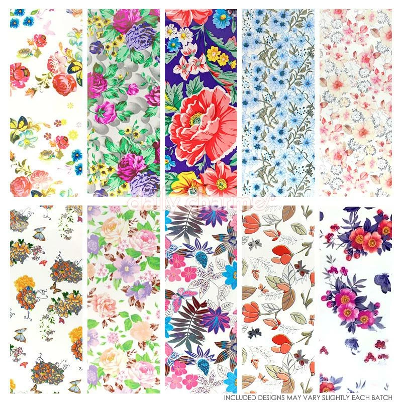 A bundle of 10 different floral designs and pattern nail art foil papers. Each style comes in an individual bag of 10 pieces, so you will receive 100 foil papers total!