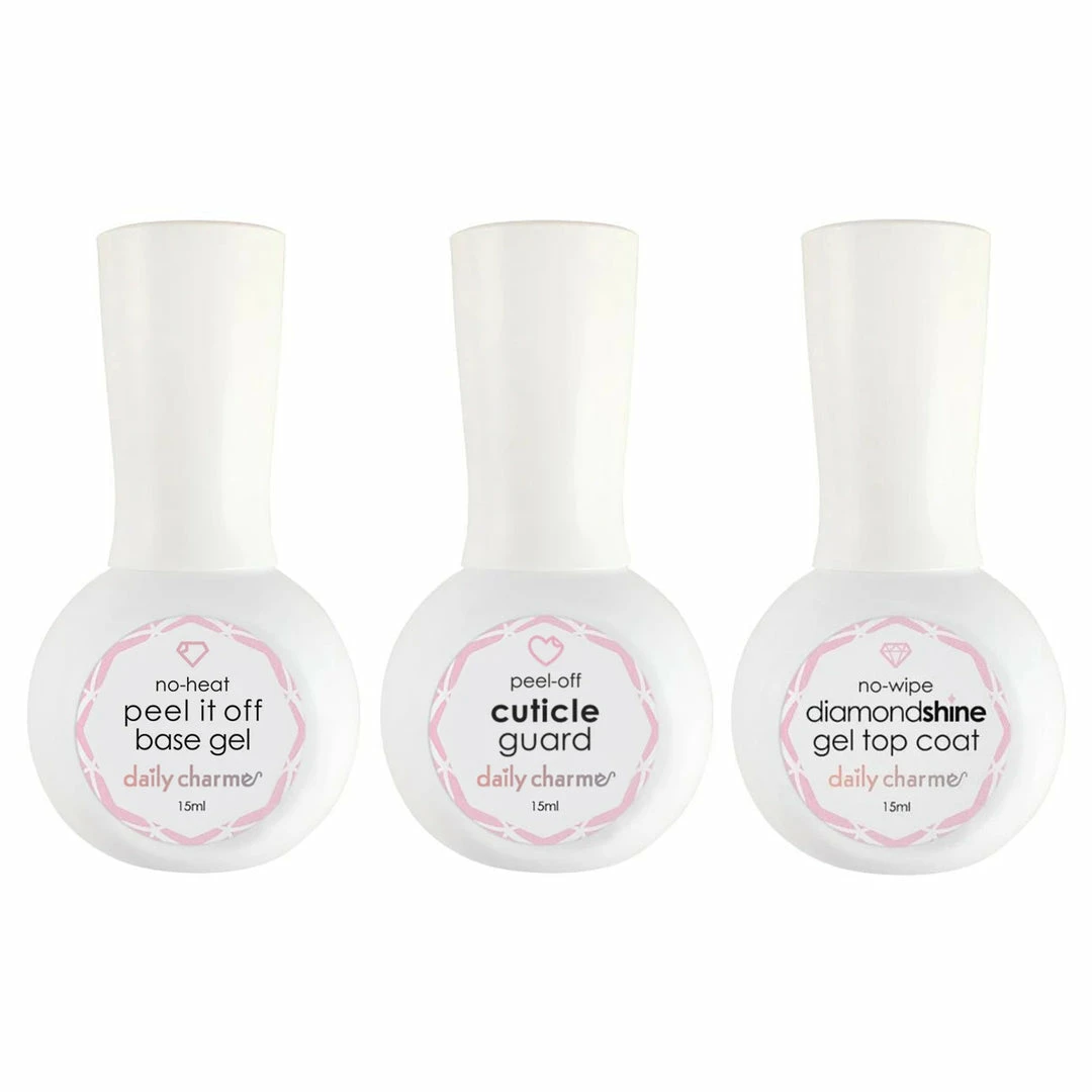 Daily Charme DIY Essentials Kit is a must have bundle for at home gel manicure. Our unique Peel Off Base Gel makes gel removal easy peasy, say goodbye to soaking your fingers in acetone!