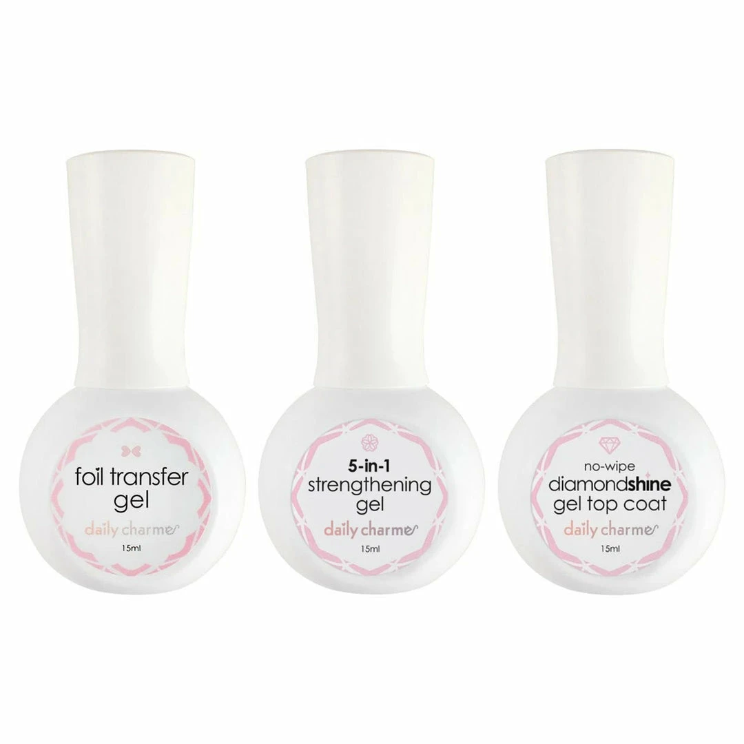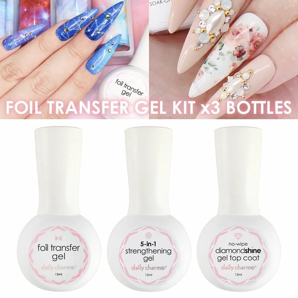 Daily Charme Foil Transfer Gel Kit comes with all the essential gels you need for that perfect and long lasting foil application! Use our Foil Transfer Gel to transfer any foil paper designs, from floral and lace, to oil spill & holographic unicorn patterns! Shop for nail art foils HERE